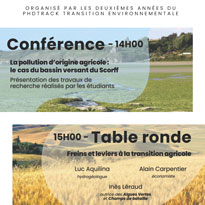 Les élèves de deuxième année du PhD Track Transition environnementale organisent une conférence intitulée La pollution d’origine agricole : le cas du bassin versant du Scorff". Cette conférence sera l'occasion de présenter leurs recherches.