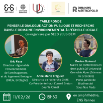 Table-ronde organisée par les associations SEED et UbiDEM, avec Eric Fisse, directeur régional de l'environnement, de l'aménagement et du logement Bretagne (DREAL Bretagne), Anne-Marie Tréguier, directrice de recherche CNRS, co-présidente Haut Conseil Breton pour le Climat et Dorian Guinard, maître de conférences en droit public à l'Université Grenoble Alpes (Sciences Po Grenoble) et Porte-parole de Biodiversité Sous Nos Pieds.